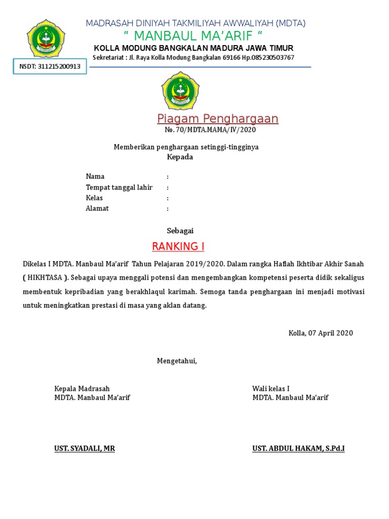 Piagam Penghargaan Nilai Terbaik Un Siswa Ma Nw Suralaga 2017 Belajar Undangan Tanggal